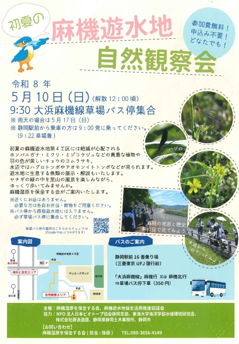 毎年恒例!「初夏の麻機遊水地自然観察会」が麻機遊水地第4工区で開催されます。参加費無料で申込も不要なので、どなたでも気軽にご参加いただけます。詳しくはチラシをご確認ください。お問合せは、麻機湿原を保全する会(担当:後藤)まで。